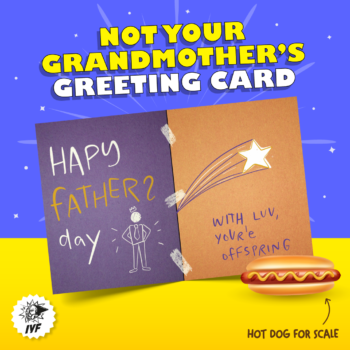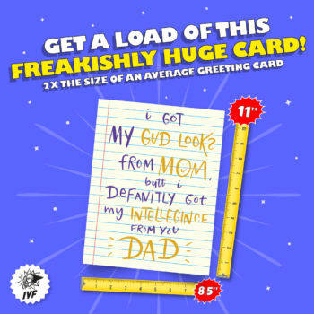 There are so many terrible things that come with having a hot mom, but one of the worst has to be the absolute guarantee that your dad is a total dummy. Maybe you’re living in a bad sitcom where your sexy sassy smart mom inexplicably procreated with an oafish troglodyte whose every utterance brings on the canned studio audience laughter that haunts your dreams. Maybe your mom was a spokesmodel on an infomercial and fell in love with the moron who couldn’t open the jar. Either way, how do we put our stupid but lucky loveable dad in his place? Get him this Father’s Day card! Because he’s smart enough to know that his real gift is that he gets to do what every kid in your class reminded you that they wanted to do every day in eighth grade – he gets to bang your mom.