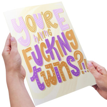 For centuries, the scientific community was convinced that there were only two types of twins – sexy twins and evil/creepy twins. Recently, however, science discovered a third type of twins – baby twins. Grown inside a lady and terrifying in a different way, this third type of twins may be soon emerging from a friend or loved one of yours. If so, be ready with this giant congratulations card. It has the “F” word on it twice, which is likely half the amount of times future mommy and daddy used it when the ultrasound revealed twins.