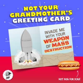 If love is war, then the campaign of combat that you waged to conquer the heart of your loved one would go down in the books as legendary. Sure, you’re living under a treaty now, and day to day life under the armistice is okay. But every now and again you have to dust off the old love missile to ensure continued occupation of certain territories if ya know what we mean, wink wink, nudge nudge (we’re talkin’ genitals here). This Valentines Day, prepare for an erotic consensual invasion with this gigantic card, and maybe a nice scented candle.