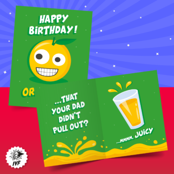 Do you have any idea how close you came to not even being born, dude? So many factors had to cosmically line up in order for you to scream your way into existence. Remind friends and loved ones of the grossest factor possible with this cheerful citrus-tastic birthday card. Filled with vitamin C – not “vitamin C;” your mom absorbed all that.