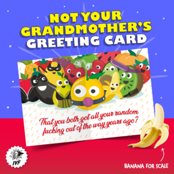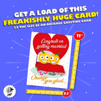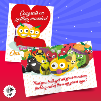 When two people find each other in love and want to spend the rest of their lives together, nothing could be more pure. So when that special day comes, the whole cast of characters they both had to “encounter” on their quest for the real thing tends to be forgotten. Remind the love birds of the horror show they’re leaving behind and fill them with grateful relief when you give them this fresh and fruity card.